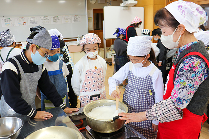 同運動では、JA職員や女性部の食農リーダーが小学校に出向いて大豆の栽培や加工品作りを指導しています。令和6年度は、依頼のあった管内小学校33校に大豆種子を配付し、6月に植え付け指導を行いました。その中の15校に対しては、12月から2月にかけて収穫した大豆を使用した豆腐作りやきな粉飴作りの出前授業を行いました。