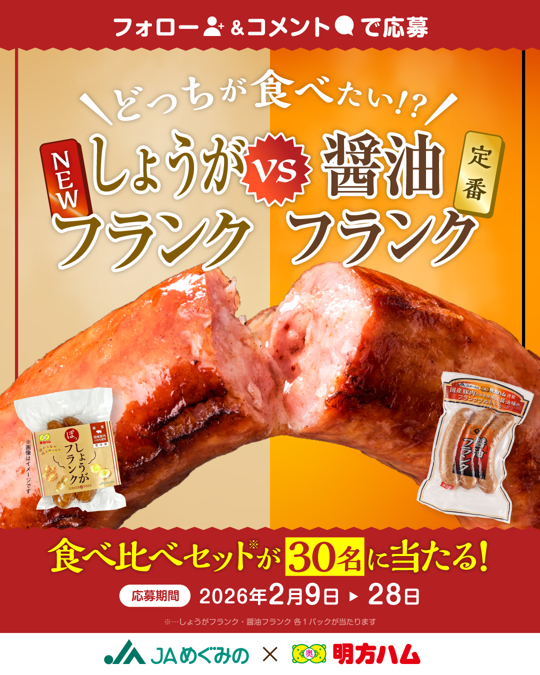 2026/02/09 JAめぐみのInstagram開設記念キャンペーンのお知らせ JAめぐみの公式Instagram開設を記念し、明方ハムとのコラボキャンペーンを実施いたします。 この機会にぜひフォローして、ご応募ください。 下の画像をタップして、JAめぐみの公式アカウントへGO!! キャンペーン応募要項 (PDF: 329.7KB)